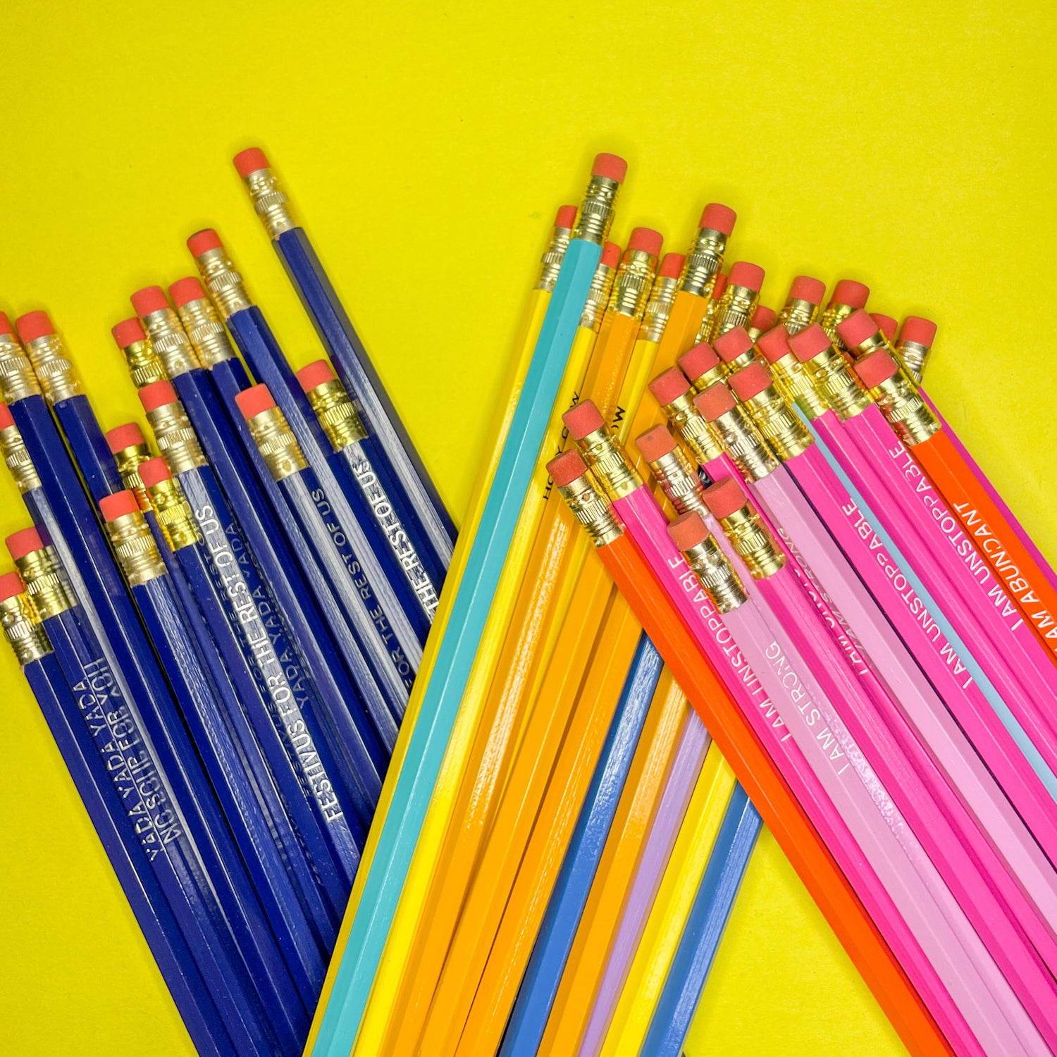 Pencils are hand stamped right here in the studio. All pencils that are stamped imperfectly, 'pencil oppsies', are donated to teachers in need all across the United States.