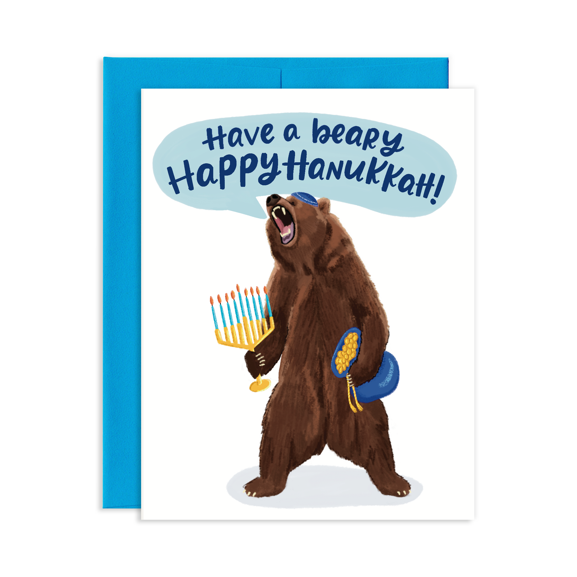Spread some Beary Happy Hanukkah cheer to your loved ones with this funny greeting card! Featuring a growling bear wearing a yamaka and holding a menorah, this card is sure to give any recipient a joyous chuckle. Share the joy of the season and have a beary Happy Hanukkah!