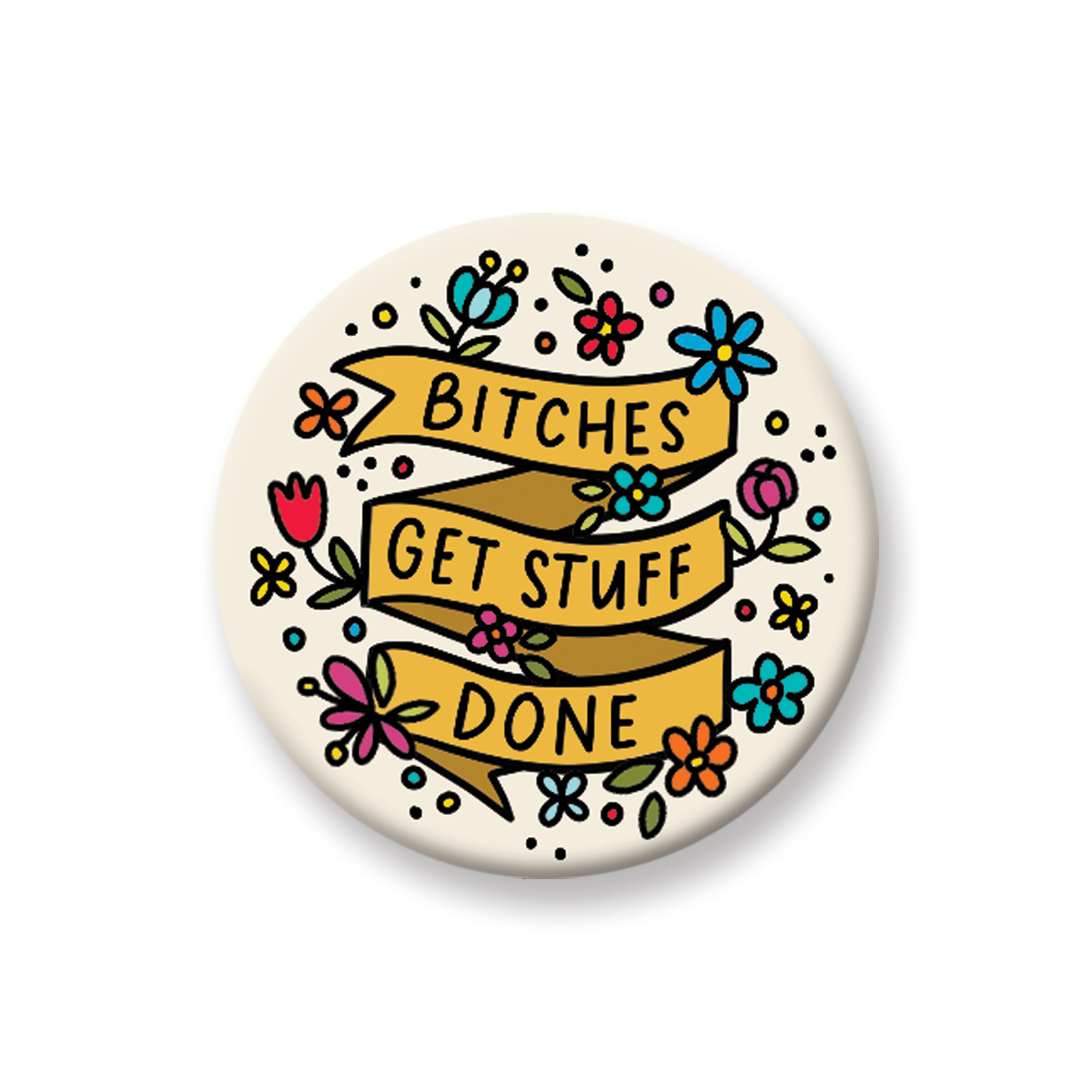 Show off your confidence and determination with our Bitches Get Stuff Done Pin-Back Button. This button is a stylish and straightforward way to make a statement and demonstrate your ability to handle any task that comes your way. With this button, you'll be able to show others that you are not afraid to take charge and get things done.