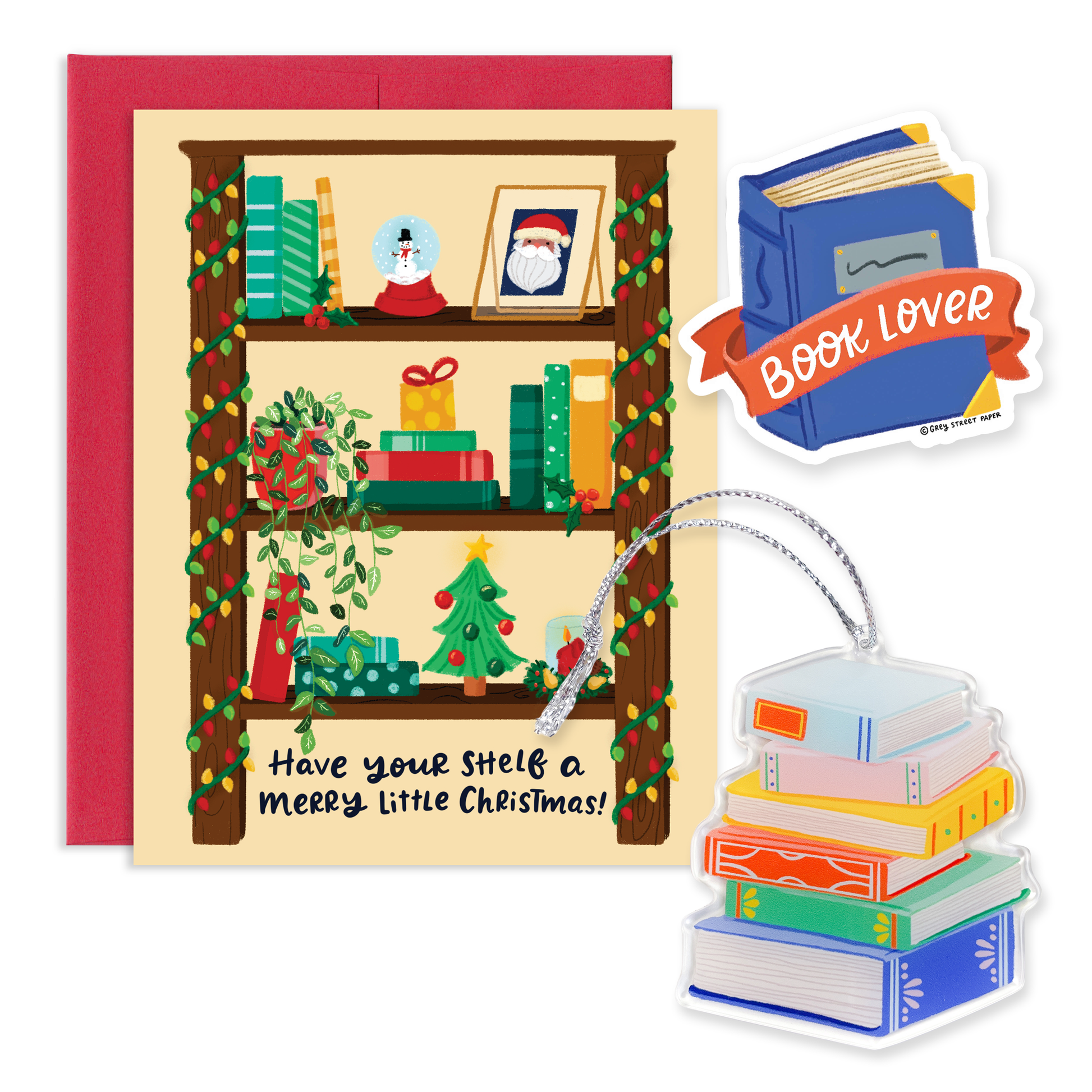 Make this holiday season extra bookish and share your love of literature with this bookish Book Holiday Ornament Card set! Includes a bookshelf Christmas card, a book lover vinyl sticker, and a book stack acrylic ornament - perfect for the bibliophile in your life! 📚😍