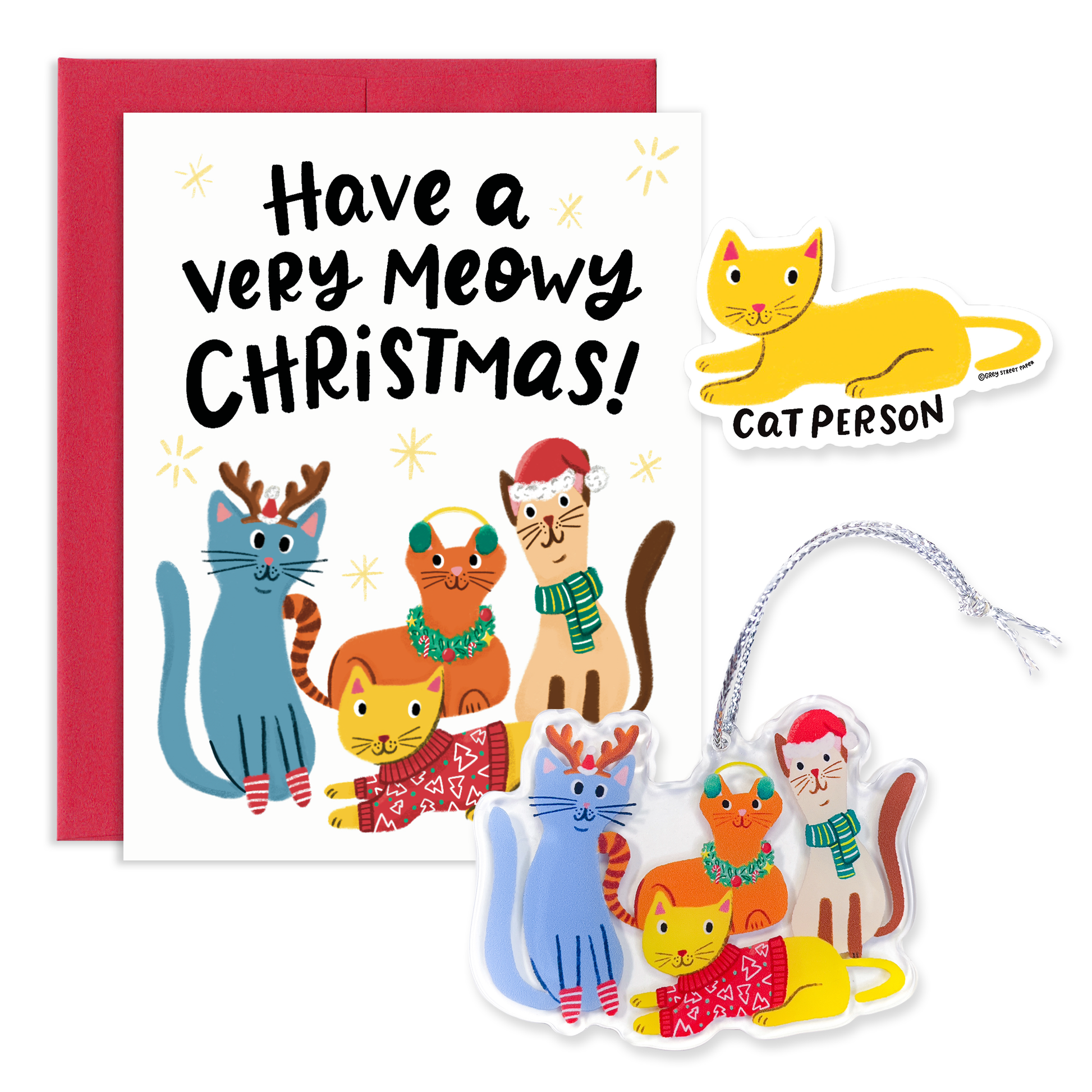 Surprise your feline-loving friends with this paw-some holiday card set! It includes a purr-fectly delightful Christmas card, a festive cat-shaped acrylic ornament, plus a cat person sticker to display all year round. So much cuteness, it'll make their whiskers twitch! 🐱
