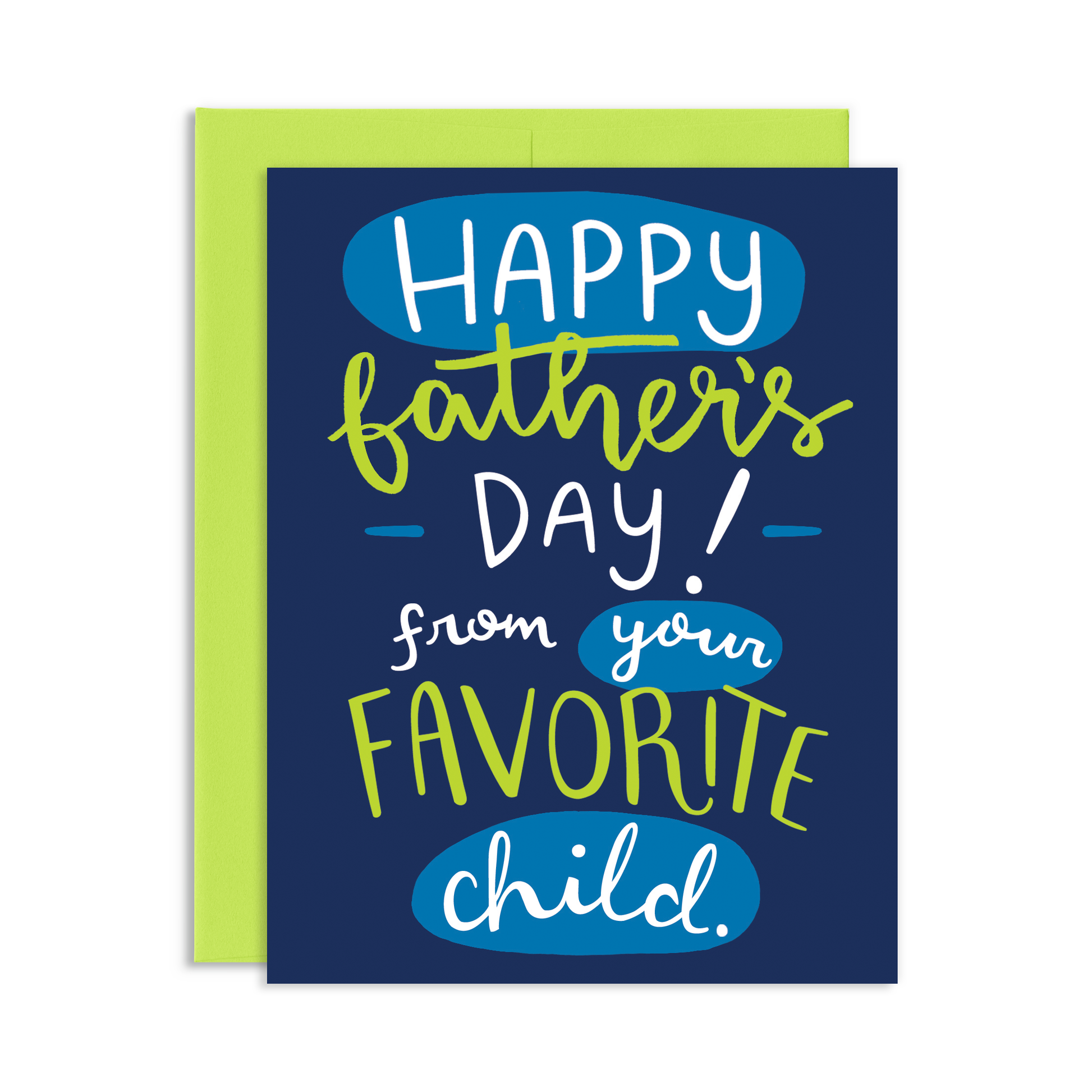 Looking for a Father's Day card that will let your dad know that he has a clear favorite child? Our "Happy Father's Day from your favorite child!" greeting card is the perfect way to let your dad know that, despite all of your siblings, you are the one he truly loves the most. With its cheeky message and bright colors, it's sure to make him smile and maybe even spark a little friendly competition among your siblings. Show your dad how much you love and appreciate him, even if she does have a favorite. Just be prepared for your siblings to be a little jealous!