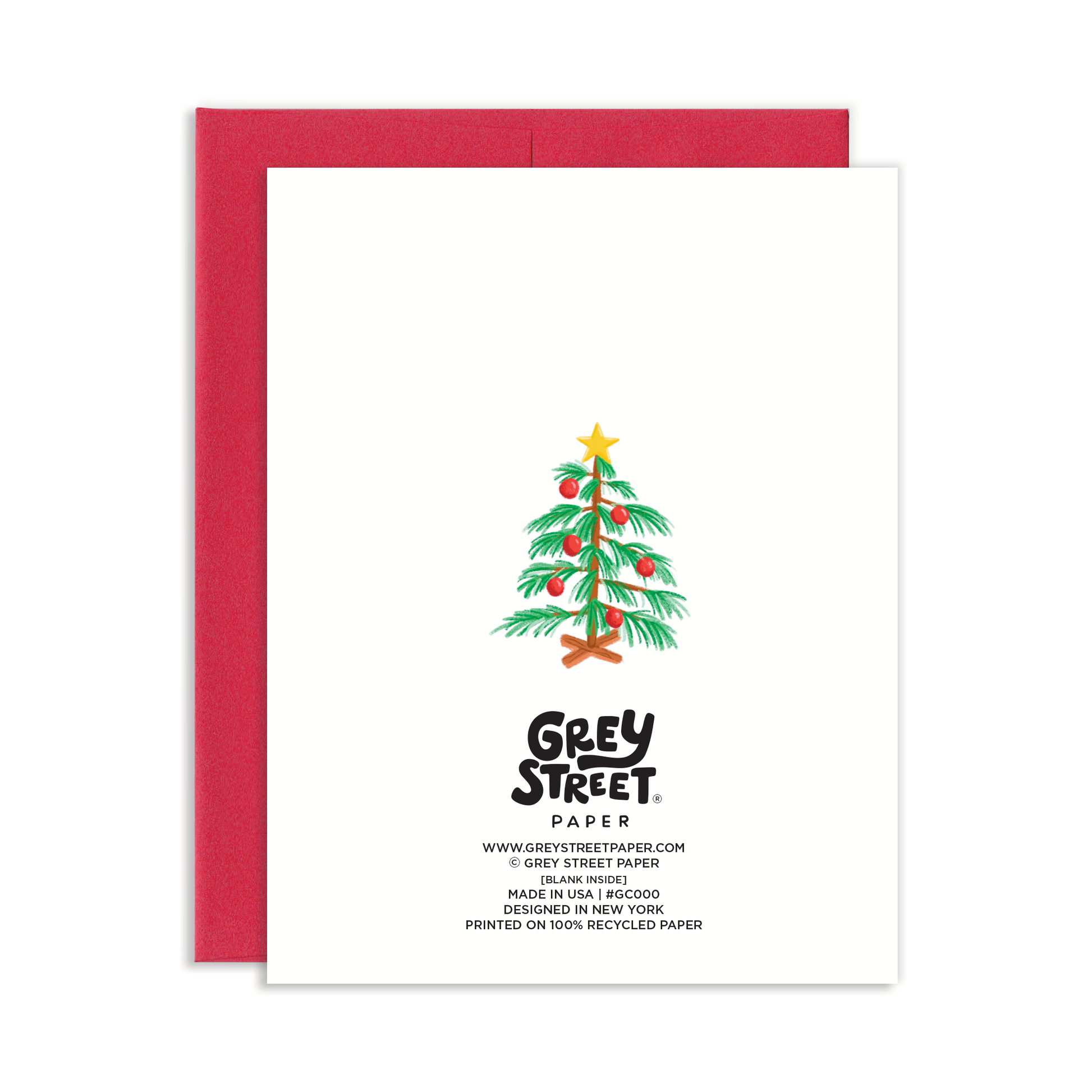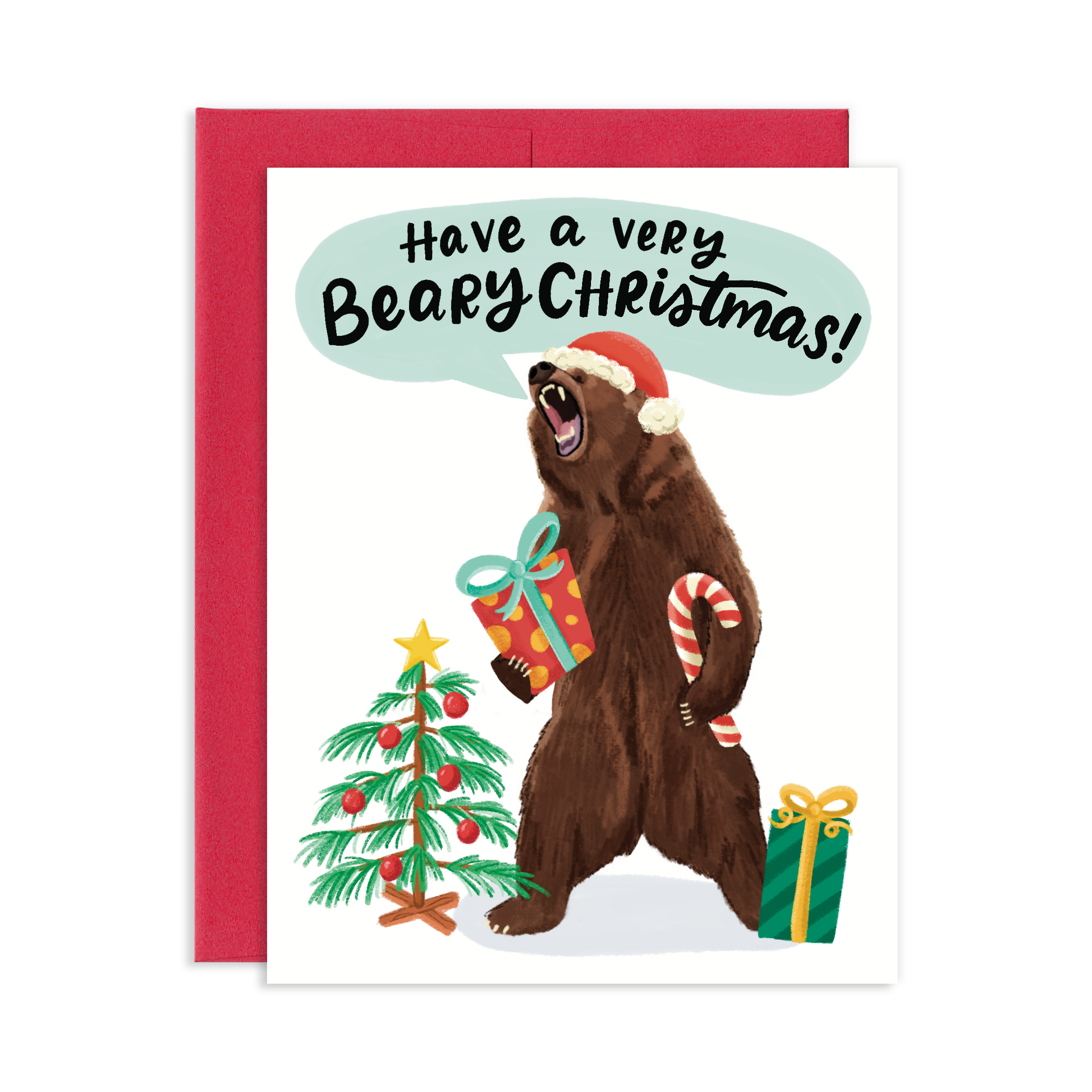Spread holiday cheer in a 'Beary' festive way with this fun Christmas card! Featuring an adorable bear full of presents and wearing a Santa hat, it's sure to bring a smile to the faces of your friends and family. Have a 'beary' merry Christmas this holiday season!
