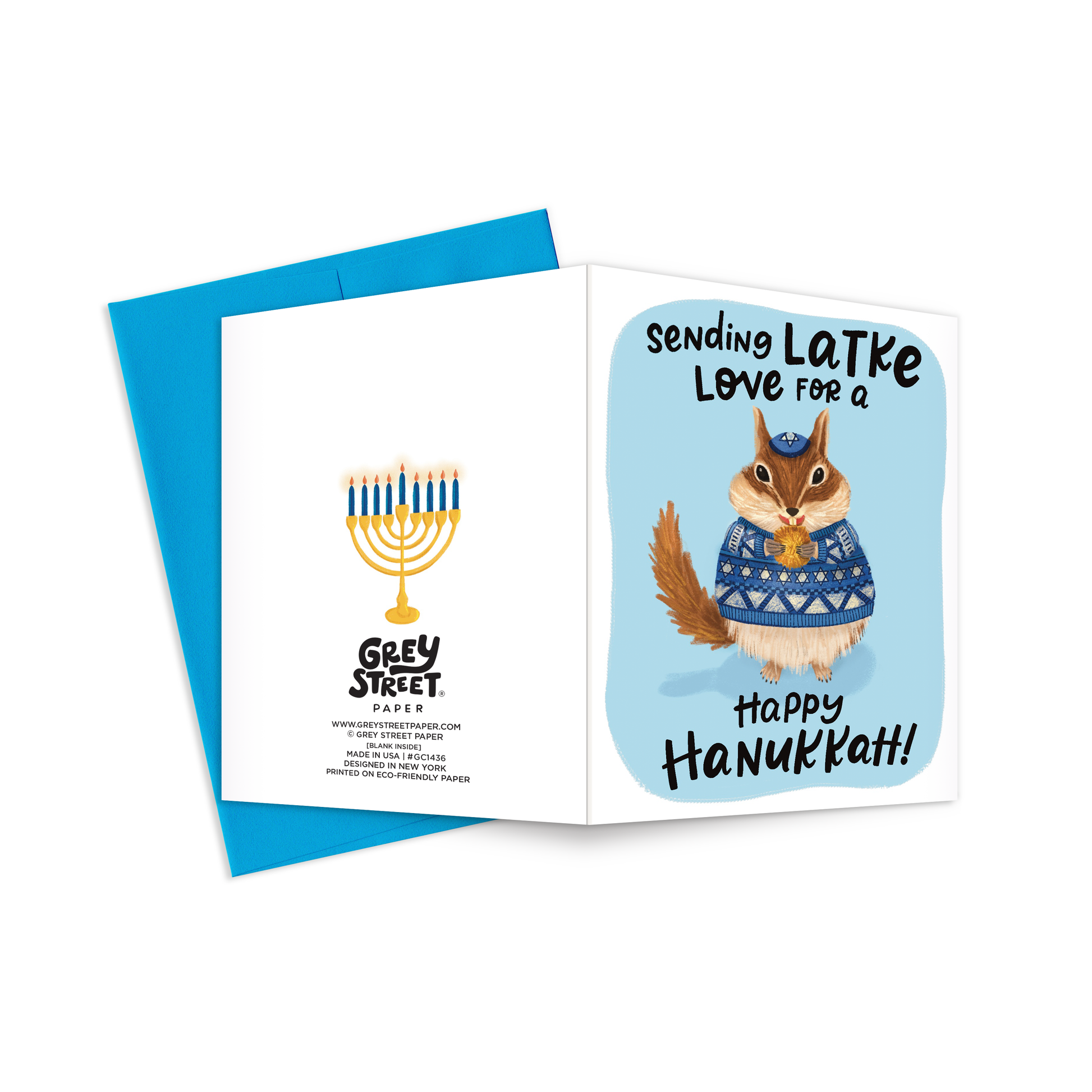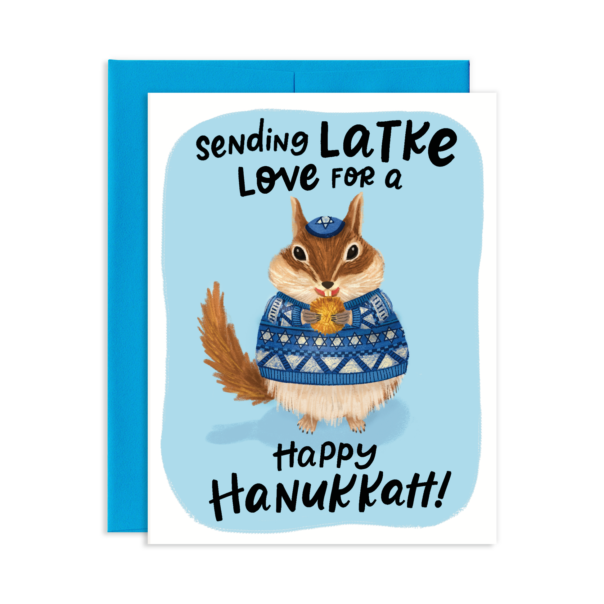 Light up your loved one's Hanukkah with the Latke Love Chipmunk Hanukkah Greeting Card! This cute card features a chipmunk in a cozy sweater, sending a message of "Latke love for a Happy Hanukkah!" Spread some cheer and a bit of pun with this one-of-a-kind Hanukkah card!
