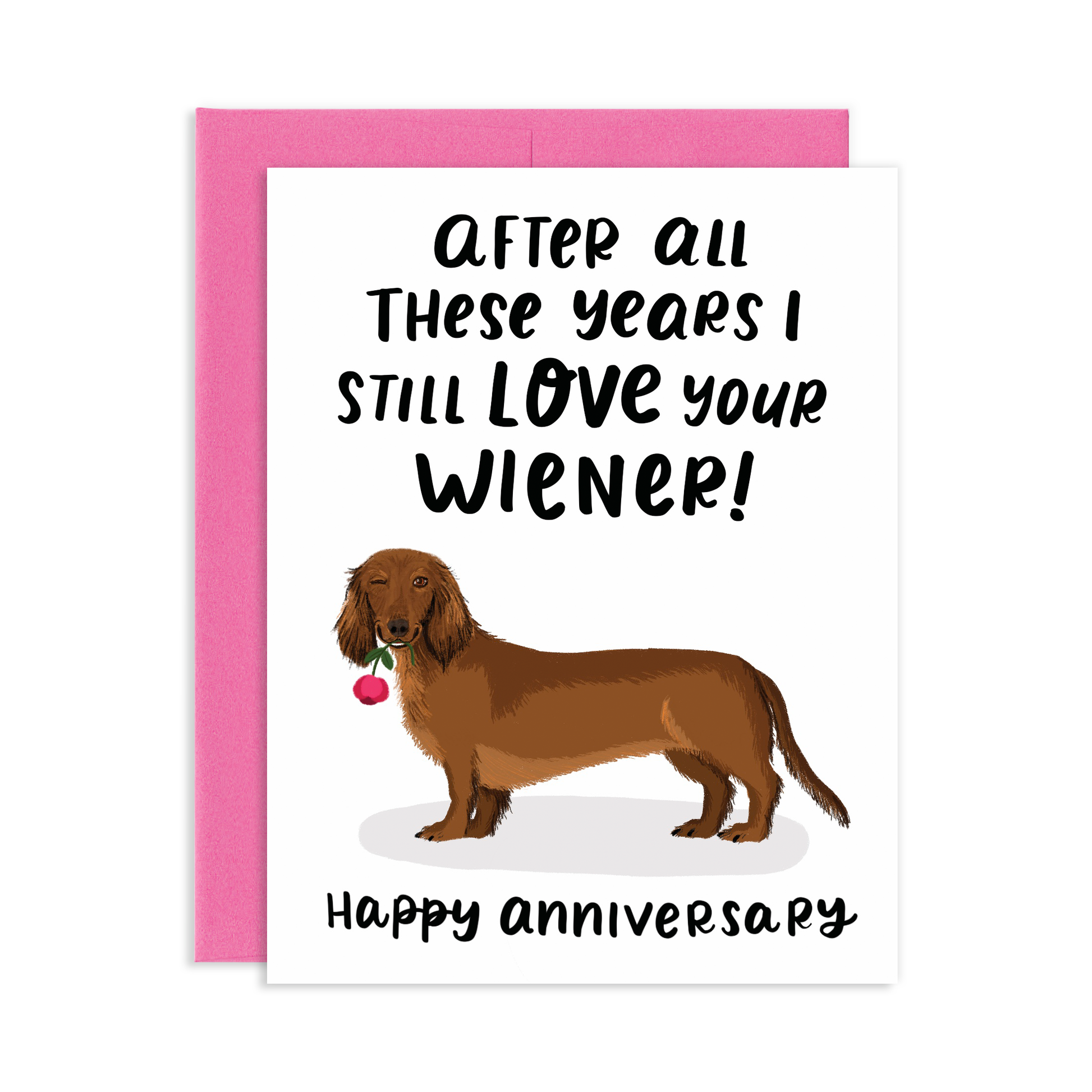 Our "Love Your Wiener" anniversary greeting card featuring a playful dashchund dog is sure to have your partner howling with laughter. A winking wiener dog with roses? Yes, please! Whether you're celebrating your second anniversary or your 50th, after all these years, show your significant other how much you love them this funny anniversary card. It's is sure to put a smile on your partner's face. *wink* *wink*