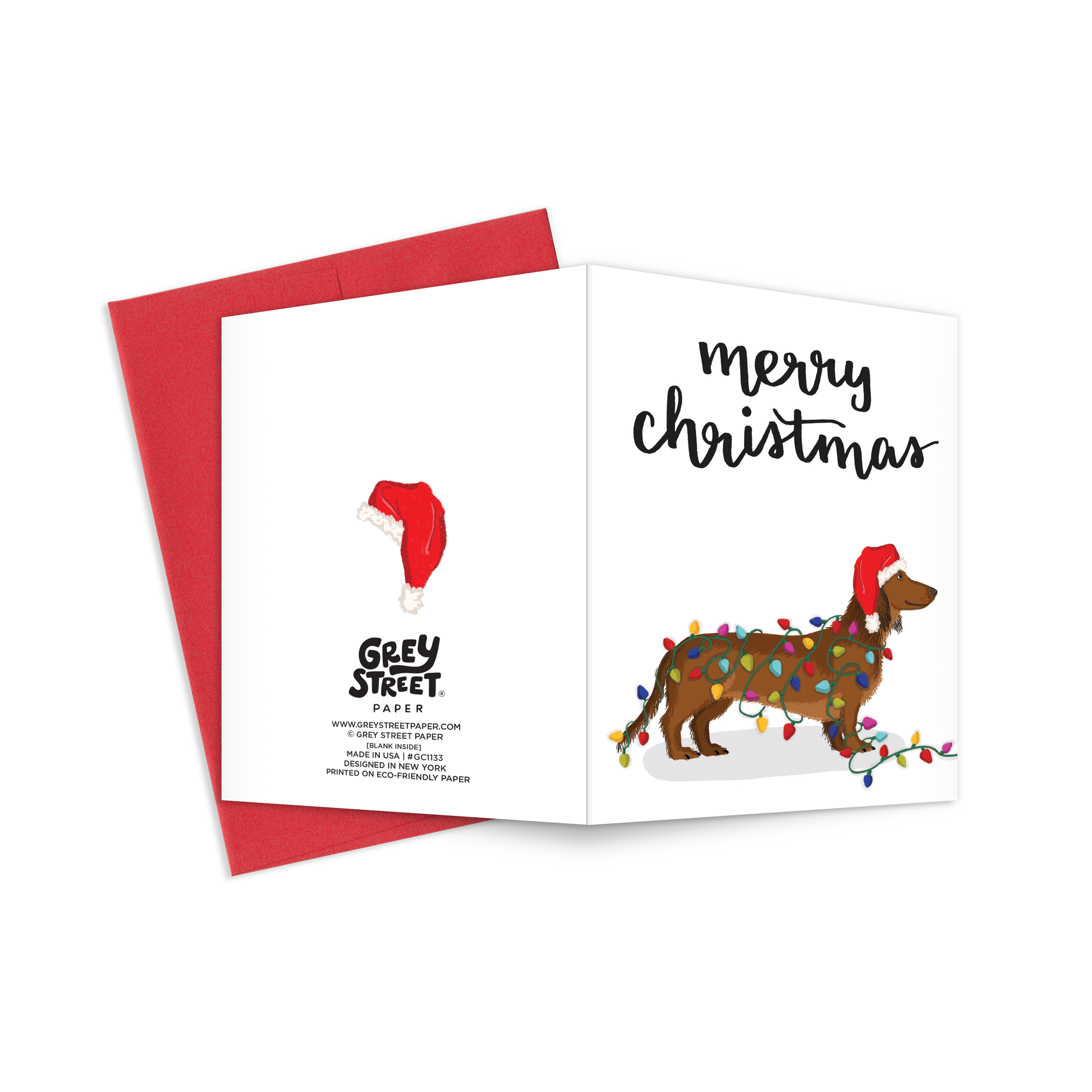 Bring festive cheer with this playful Christmas Lights Dog Greeting Card featuring a charming dachshund wrapped in glowing Christmas lights and topped with a Santa hat. Perfect for spreading joy and smiles, this card captures the fun spirit of the season and is sure to delight dog lovers and holiday fans alike.