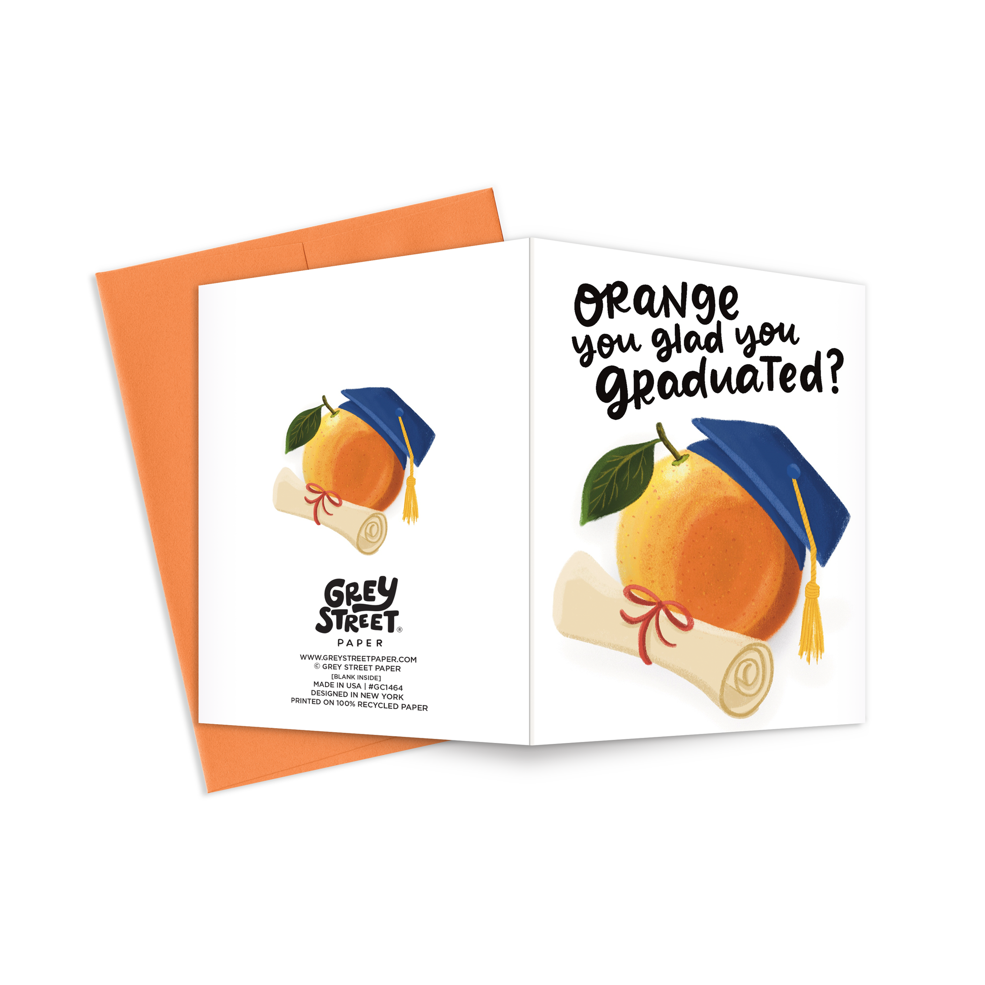 Orange you glad you graduated? Congrats on peeling (😉) off your cap & gown! Share the joy with this fun orange graduation card. A punny way to say 'well done' to a fresh graduate. 🍊🎓