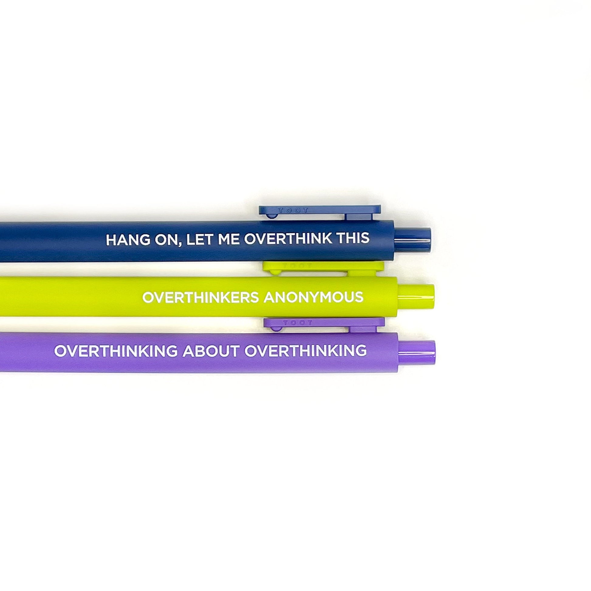 Introducing the Overthinkers Pen Set - perfect for the indecisive, overanalyzing, and always thinking individual. This set includes three jotter pens with comfortable grips and smooth ink flow to help you jot down all your thoughts and ideas. Don't overthink it, just get this pen set (or maybe you should...or shouldn't...oh, just get it!).