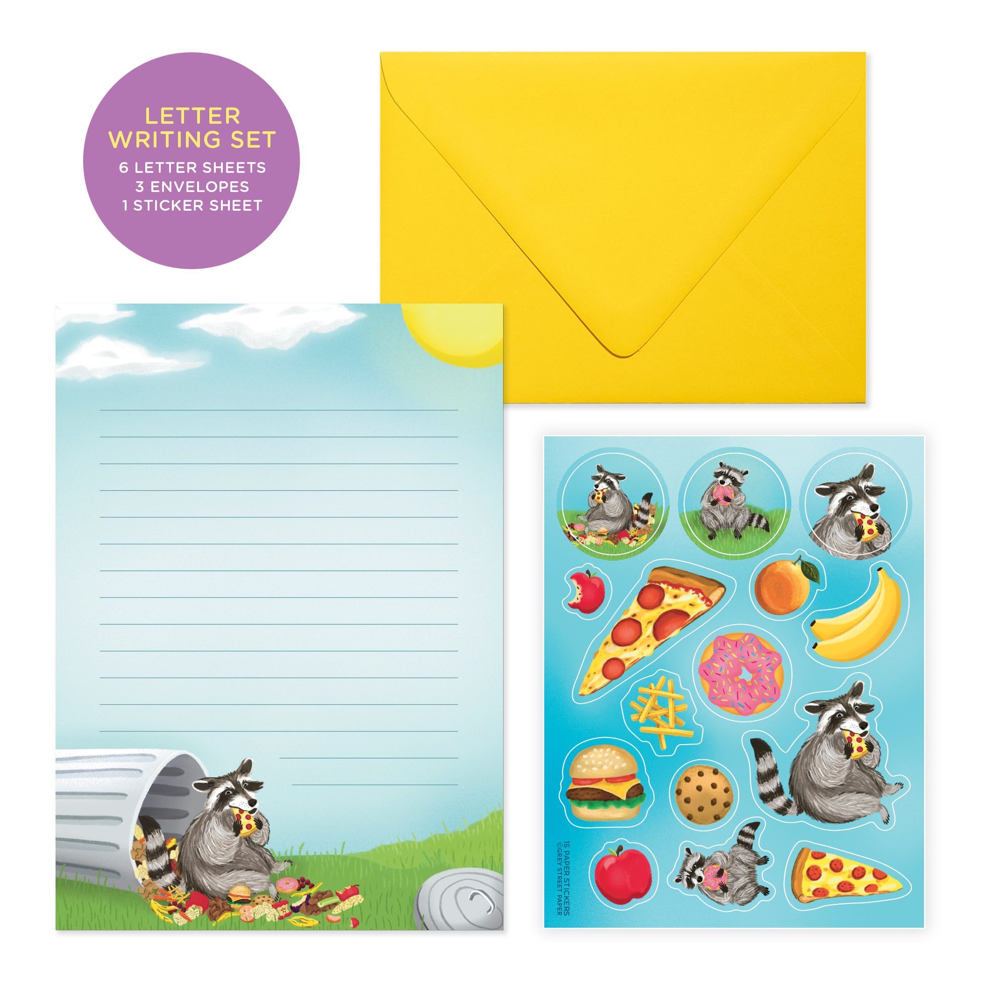 Indulge in some mischievous letter writing with the Trash Pizza Raccoon Letter Writing Set. This kit includes 6 illustrated letter sheets, 3 bright yellow envelopes, and a paper sticker sheet featuring adorable raccoons devouring junk food. Each letter sheet features n adorable raccoon enjoying pizza from a trash can, while the sticker sheet includes 15 stickers of raccoons munching on junk food along with pizza, burgers, fries, and more. Perfect for any fun-loving pen pal!
